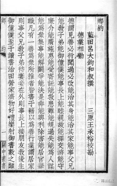 王阳明的《南赣乡约》源于陕西蓝田《吕氏乡约》,此说是有依据的。《王阳明全集》及清同治版《赣州府志》均收录了王阳明大弟子邹守益(安福人, 翰林侍读学士)的一篇文章,《南赣乡约后语》:“此中丞阳明王公参酌蓝田乡约,以协和南赣山谷之民也。呜呼!蓝田,通都大邑,名卿世族也。公以世族大邑之法,望于村童野叟, 其仁矣。‘民之秉彝,如是懿德。’不以村童野叟异于通都大邑、名卿世族也。凡吾民之受告谕者,仰体我公协和之仁,以仁阙身。其果于为善也,如饥之求食,渴之求饮;其不果于为不善也,如食之不可以乌喙,而饮之不可以酖酒也。则于秉彝之德尚其不爽,而三代之风可庶几乎!父兄子弟,曾有饥而弗食、渴而弗饮者乎?曾有充饥以野葛者乎,止渴以酖酒者乎?身之死则知重之,心之死则不知重,其亦弗思焉耳矣。《易》曰:‘善不积不足以成名,恶不积不足以灭身。小人以小善为无益而弗为也,以小恶为无伤而弗去也;故恶积而不可掩,罪大而不可解。’呜呼!吾民盍相与敬思之。”邹守益这篇文章明确说明《南赣乡约》乃参考蓝田《吕氏乡约》而来。