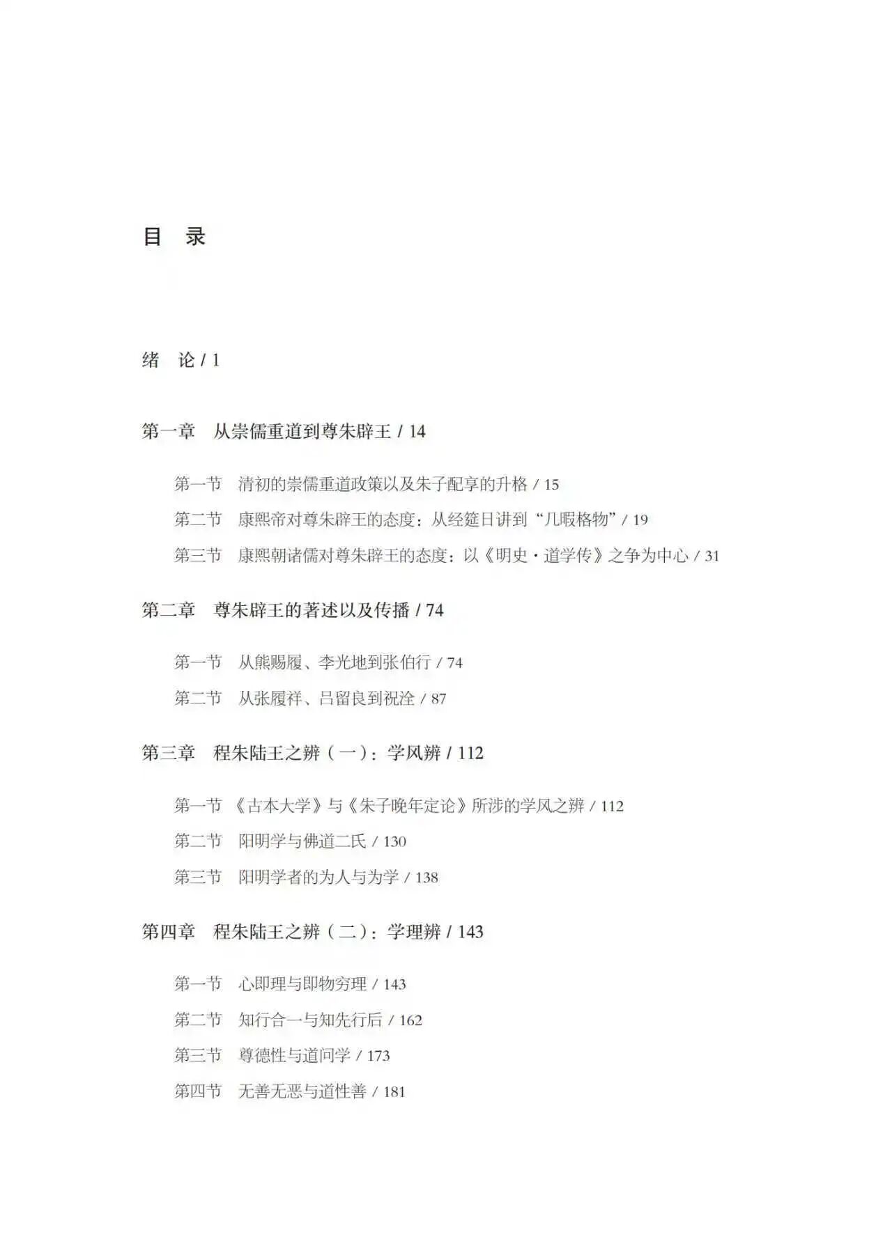 第二章梳理“尊朱辟王”的著述以及传播,以张烈、陆陇其、张伯行为代表的官方学者与以张履祥、吕留良为代表的民间学者,都积极从事于“尊朱辟王”的著述及其刊刻,如张烈《王学质疑》、陆陇其《学术辨》《松阳讲义》与张伯行《正谊堂全书》、吕留良天盖楼版“程朱遗书”,以及当时书院的程朱理学讲会与出版活动等,共同推动了朱子学的广泛传播。